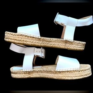 White leather espadrille style sandals from Saks Fifth Avenue. Features ankle strap with front buckle and 1” platform footbed. In excellent, pre-loved condition. Ladies size 10
