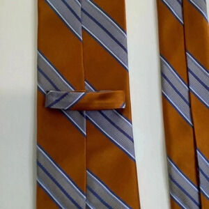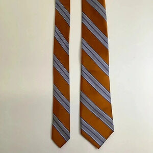 Discover luxury and finesse with this exquisite Saks Fifth Avenue 100% silk tie. Crafted in alluring hues of copper and French blue, it features a classic American striped print that lends a sophisticated touch to any look.