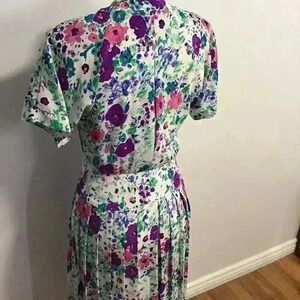 Beautiful vintage floral print dress with short sleeves and pleated skirt.