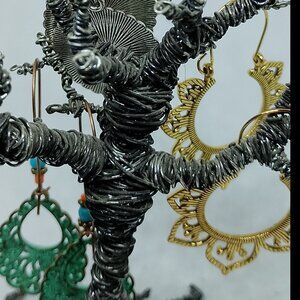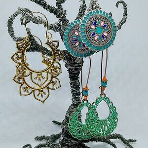 3 Different Pairs of Dangly Earrings. New, never worn. They have a South Western Ethnic vibe... These are bronzy golden, Patinated, silver-tone metal with pink and blue accents.. Measurements as in the picture. The Ear Wires are likely plated steel or iron... I don't create the BLUE BUNNY BOHO Jewelry. That is what I'm calling the affordable pretties that I may pick up for you from time to time... ENJOY and Protect Your Peace!