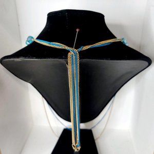 This necklace is so unique! It is a very long 31" statement necklace that features gold tone and blue painted chains. On each side there are blue beads that are multifaceted and catch the light really nicely as well as an cream colored enamel flower.