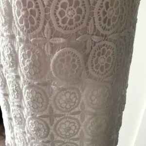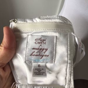 Suzi Chin for Maggy London strapless dress. All over crochet with satin waist detail. Built in adjustable shelf bra. Adhesive along the top of the bodice for security. Lined. One part of the crochet has come apart as pictured.