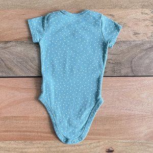 Green short sleeve bodysuit with white heart polka dot pattern.