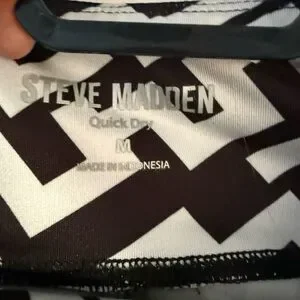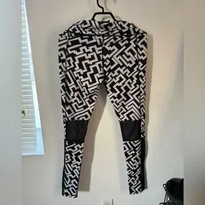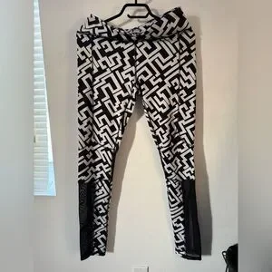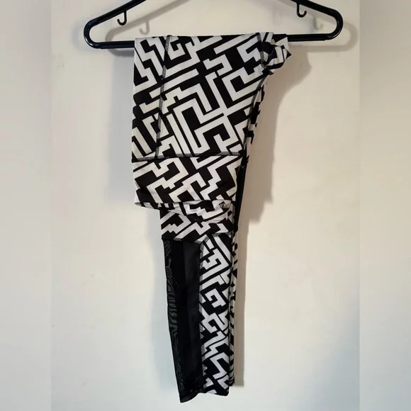 Chic leggings with a geometric pattern. Features bold black and white design.