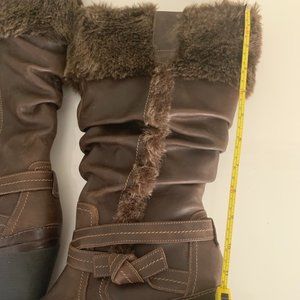 Worn 2-3 times. Clark’s Artisan tall brown wedge-heeled leather winter boots with a faux fur trim. They are ruched with a beautiful tie knot side detail. Shaft measures approximately 11.25" from arch. Heel measures approximately 3". Platform measures approximately 0.5". In really good condition.