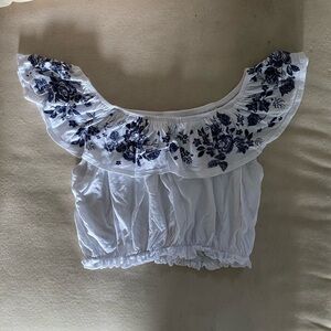 SALE GARAGE White Off-the-Shoulder crop top with Navy Embroidered Collar size XS