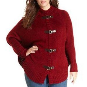 Lovely burgundy cape with snap buttons and buckle detail closure. Can be worn as a cardigan or as outer wear. Ribbed cuffs, neck, and hem