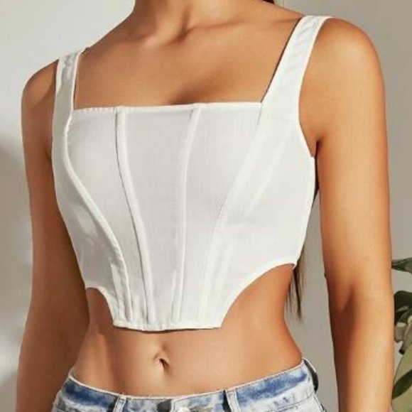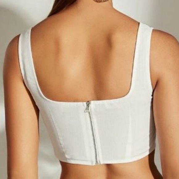 White asymmetrical tank with fitted bodice. Zipper at back.