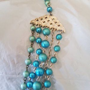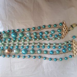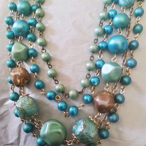 VINTAGE 5 STRAND NECKLACE NO NAME , 4STANDS BEADS , 1 STRAND CHAIN . 17 IN LONG . EXTENDRR 3 IN L. MIX MEDIUM COLORED BEADS , NEVER USED .
