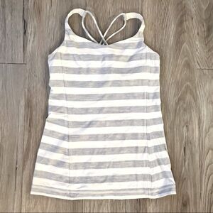 Striped tank features crossing straps, built in bra (padding is missing), fast wicking fabric and great stretch.