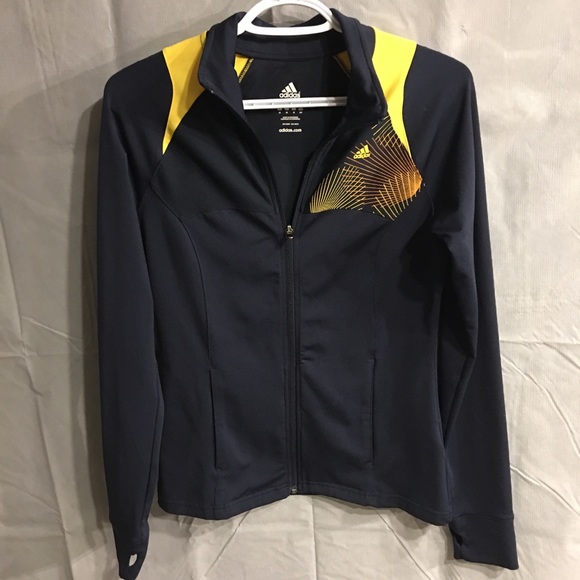 This Adidas track jacket has a very eye catching design. The yellow and orange really complement the deep blue nicely. 😊