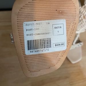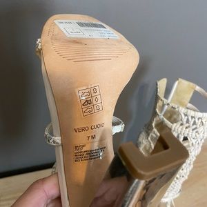 📌. NEW CONDITION stunning leather heeled sandals from BCBGMAXAZRIA. Beige and metallic silver colors. Beautiful breaded details. Miroir heel. Back zipper closer. Leather upper and sole. Man made lining. The heel is 4.5 inches tall. With serial #.
