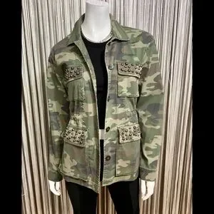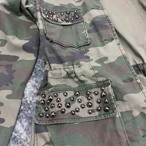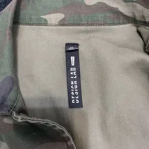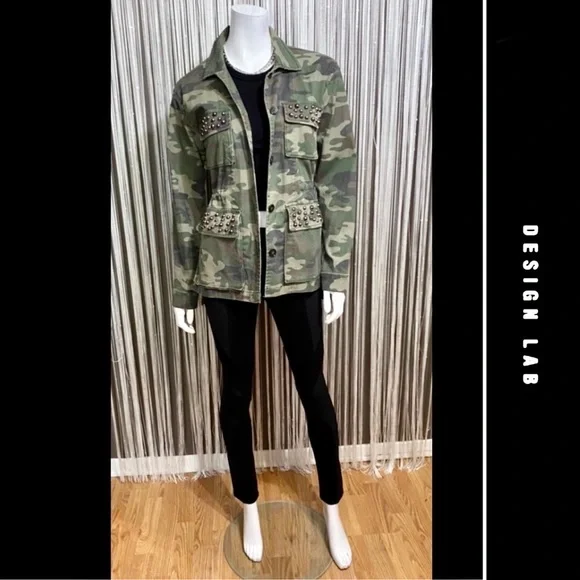 📌. EXCELLENT CONDITION beautiful camo denim coat from DESIGN LAB. Beautiful silver round studs details on all front pockets. Ajustable strand at the waistline on the inside. Black front buttons closer.