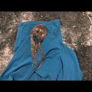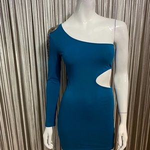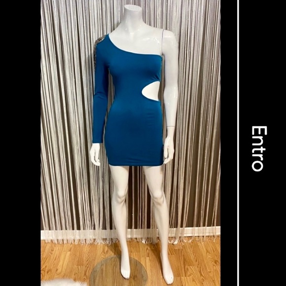📌. EXCELLENT CONDITION stunning blue one sleeve dress from ENTRO. Gray silver beads jewelry on one shoulder. Sexy cutout. Stretch materials.
