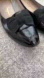 Salvatore Ferragamo Boutique vintage black patent flat loafer shoes with fabric bow. Almond toe shape. Made in Italy. Interior stamp 21860 414.