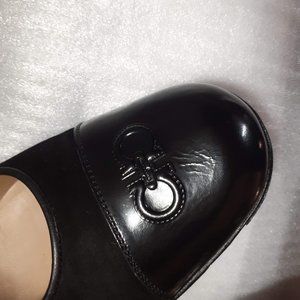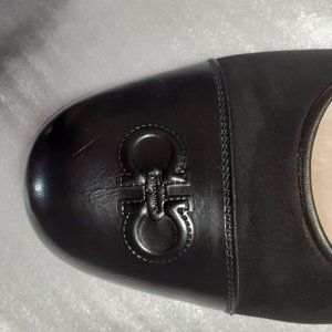 SALVATORE FERRAGAMO CLASSIC LOGO SOFT SUEDE+PATENT LEATHER SQUARE TOE LOW PUMPS,BLACK 8us