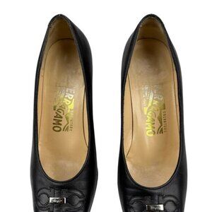 SALVATORE FERRAGAMO Metal Logo Classic Black Leather Heel Size 5.5 Made In Italy