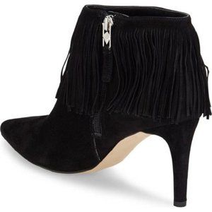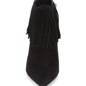 Put a little swing in your stride with these fringed booties that can go from boho-chic to mod cool in an instant. A pointy toe and slim heel keep them contemporary, while supple kid suede adds a touch of luxe. They are in mint condition having been worn once for an indoor event.