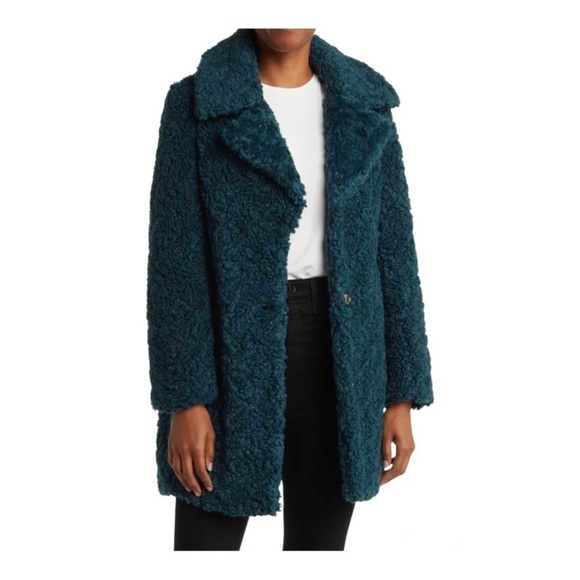 SAM EDELMAN Notch Collar Faux Teddy Fur Coat In Emerald Isle