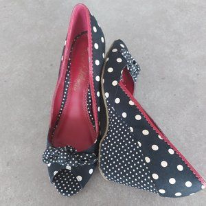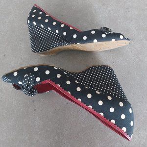 SAM EDELMAN Textile Upper Wedge Peep Toe Shoe w/Bow Black White Red - Size 8.5M