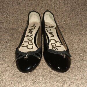 SAM EDELMAN-Natalie-Black Patent Leather-Ribbon Trim-Bow-Gold Heel-7.5-Near Mint
