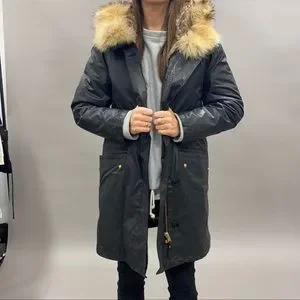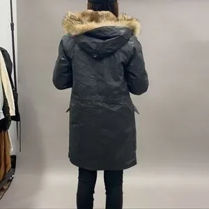 Super warm! Great length worn 3 times. Fur lined! Hooded. Big pockets.