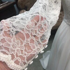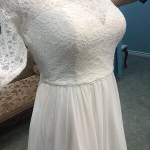 This is for a New shop sample Ivory "bridal size" 22 Bridal Gown By Mori Lee. Bridal sizes are very small, and this fits more like a "regular size" 20. Please see measures below. This gown is a shop sample and has been tried on a handful of times in the shop. It is brand new with store tags, has never been worn (other than for the pics and being tried on in the store), never altered, and shows no marks or indications of having been tried on. It has lost the designer tags but has the shop tags.
