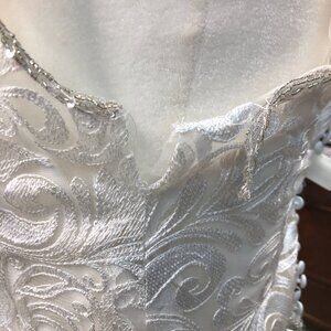 The gorgeous, lush embroidered scrolling lace overlay of this beautiful bridal gown is all covered in silver-accented thread; the gown seems to glow from within, it has a very slight sheen! So unique and unexpected! This gown is so intricatelyre-embroidered with such a delicate, silver-accented beautiful lace scroll that is also so unique and such a haute couture looking lace!!
