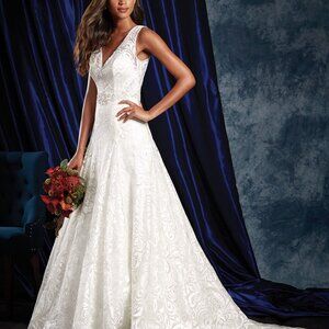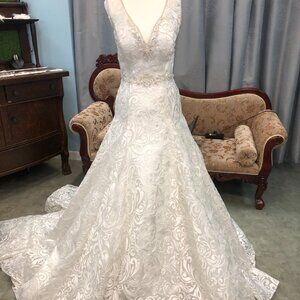 Pictures definitely don't this beautiful embroidered scrolling lace gown justice! Brand new with tags attached Alfred Angelo 969 super sexy, sophisticated lace bridal gown that just hugs the curves in all of the right places and has a plunging neckline and lace covered low back!