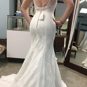 Pictures definitely don't this beautiful gown justice! This super sexy, sophisticated fit and flare bridal gown that just hugs the curves in all of the right places and has a plunging neckline and gorgeous low back!