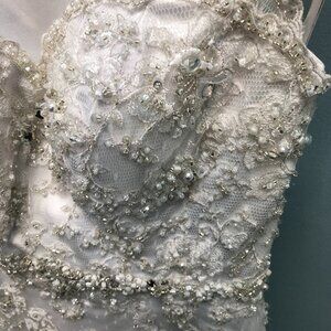 Please keep in mind that ALL designer gowns require altering, as they are made for very tall, very large-breasted women, and it's the alterations that give that million-dollar fit! Most people require a hem, a bustle, and usually adjustments around the bust and straps. This is the case with all designer gowns. These gowns can easily be taken in 2 sizes by a professional bridal seamstress, and can be let out a bit as well. Please consult with your seamstress and alterations questions!