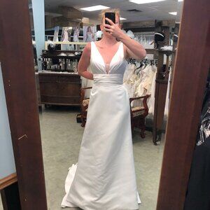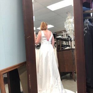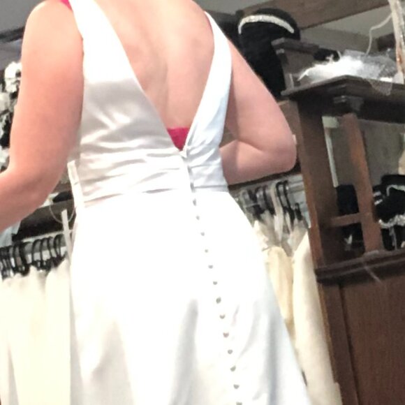 Pictures definitely don't this beautiful beachy white Satin gown justice! I love the plunging Deep Vneck (which can be filled up and in a bit more, by a seamstress, if more modesty is desired, & the plaquet could also be removed by a seamstress if you want a little more daring!) Super sexy, sophisticated Aline bridal gown that just hugs the curves in all of the right places & has a plunging neckline & low V back! The cummerbund waistband is cinched & super flattering, gorgeous satin covered buttons go down the entire train, ending in a cathedral length. So unique & unexpected! This classic gown would be brilliant for any beach or destination cruise wedding, country or barn or garden wedding. Ask your seamstress about adding POCKETS and even a LEG SLIT!!