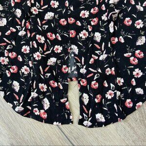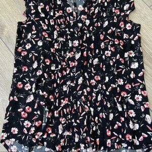 Ruffled sides and pintuck pleats down the front sweeten a lightweight woven shell with button-up styling and a charming floral print.