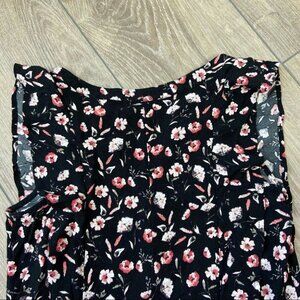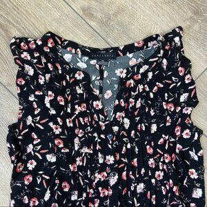 Ruffled sides and pintuck pleats down the front sweeten a lightweight woven shell with button-up styling and a charming floral print.