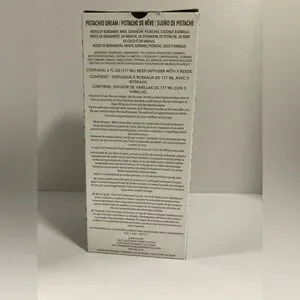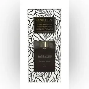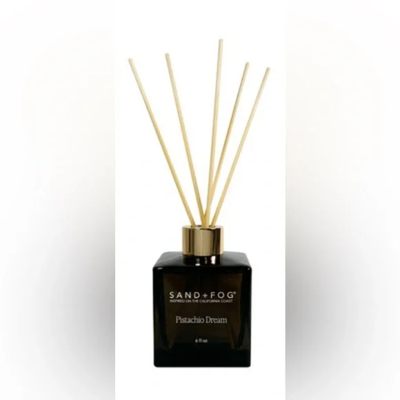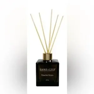 SAND+FOG Pistachio Dream reed diffuser in a sleek glass bottle. Provides continuous, subtle fragrance for home spaces. Elegant design with gold-tone accents complements decor.