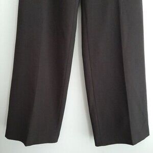 • Classic, straight leg dress pants in black with side zipper closure, belt loops and no pockets for smooth silhouette. Fully lined.