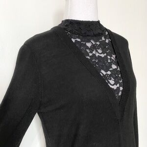 SANDRO BLACK 100% MERINO WOOL KNIT LACE NECKLINE PANEL LONG SLEEVE SWEATER DRESS