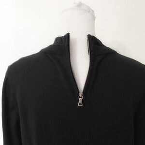 SANDRO BLACK 100% MERINO WOOL KNIT LACE NECKLINE PANEL LONG SLEEVE SWEATER DRESS, this is a minimalist, classy, classic comfy black 100% merino wool knit dress featuring a triangle lace panel neckline in a mock neck style - long sleeve - ribbed hemline, cuffs a v-neck - back exposed short zip closure in the upper back neck - super lighweight - stretch- comfy - unlined - fall and winter favorite for holiday's seasons party, first date, fancy dinner at a restaurant, valentine's day and more. Feminine and sexy yet conservative.