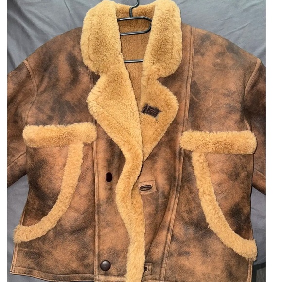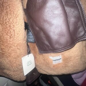 Chocolate brown Sandro shearling jacket, with leather detailing. Brand new with tags and super rare find, seen worn by Elsa Hosk (as pictured). Oversized fit, super warm and comfortable. Removable shoulder pads (pictured) so you can choose a structured or a relaxed fit. Vent detailing on the side with buttons to tighten or loosen the fit at the bottom.