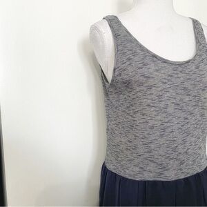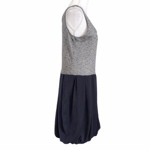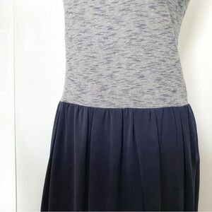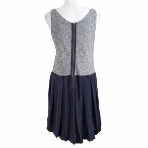 SANDRO GREY CHAMBRAY CONTRAST BLACK PLEATED BALLOON SLEEVELESS MINI CASUAL DRESS, a grey marled sleeveless upper bodice and shimmer black pleated balloon skirt casual mini dress - lower part is lined and not stretch - upper part is unlined and stretchy with an exposed back zipper closure - scoop neckline - perfect casual dress for summer season with flats or lace up sandals.