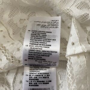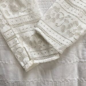 SANDRO HAMIA WHITE OPEN SHEER LACE MOCK NECK LONG SLEEVE SHOULDER PAD TOP - Polish off your look with this sophisticated lace top - Key hole back with button closure - Long sleeves - Shoulder padding - See through - High neck - Lace construction - Pull-on styling - Might need to be worn with a tone on tone white camisole underneath. Formal and chic, sleek and fitted feminine, delicate yet sexy, perfect for a night out, first date, holiday's seasons or any special evening with a black satin skirt.