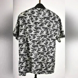 SANDRO Navy Blue White Hokusai Wave Pattern Cotton Crewneck Tee Small Portugal