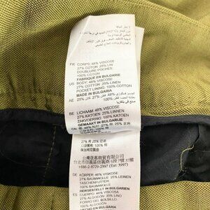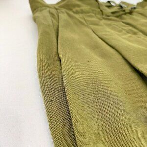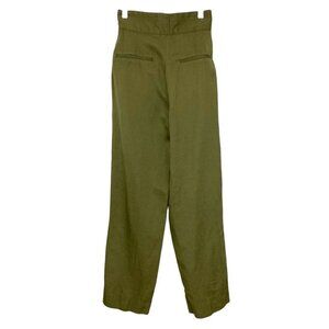 SANDRO OLIVE GREEN LINEN BLEND HIGH RISE BUCKLE WAIST STRAIGHT LEG PLEATED TROUSERS PANT, This is mix of a classy formal and military pants in this olive green linen blend super extra high rise / high waist bukled front waist straight leg pleated trousers pant featuring a zipper fly and hook & bare closure - unusually high waist for a super tailored look- chic pleating for an elevated look - unlined - not stretch - fitted - cargo vibe.
