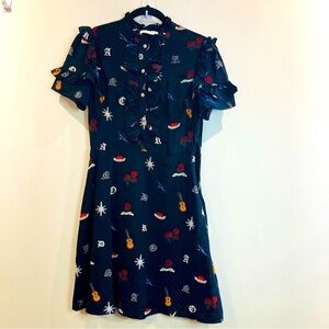 SANDRO PARIS Sz 3 (EU) US S Tattoo Print Ruffles Neckline Sleeves A-Line Dress. Luxe silk dress with maximalist jeweled buttons and feminine puff ruffle sleeves by Sandro Paris, elevated by a whimsical retro rose floral and guitar pattern. Ruffled chest detail evokes the Y2K trend. Perfect day to night dress for the career woman who wants to show off her personality! One rhinestone missing on the top button as depicted. Side zipper closure.