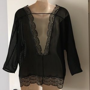 SANDRO Paris Black Crepe + Lace Deep V Back Blouse S