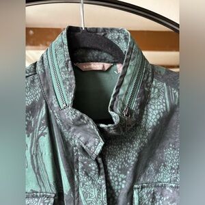 * Full length sleeves, stand-up collar with zip detailing, zip fastening through centre front concealed by tab and popper fastening, two front pockets at the bust with flap and popper fastenings, two front pockets near the hem with flap and popper fastening, seam detailing throughout, irregular hem falls longer at the front