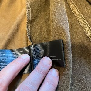 • Chic open-front cardigan in a warm brown tone, with soft faux-suede panels along the collar and front.