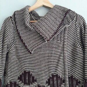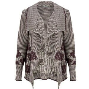 • Long sleeve open front sweater cardi in brown and cream with geometric & stripe pattern. Includes original large safety pin to have it pin closed for a different look. This Sandwich Clothing Jacquard Stripe Cardigan is the most luxe everyday staple. Style yours over plain tees and jeans to make the cardigan stand out.