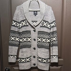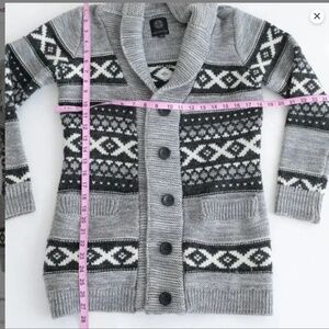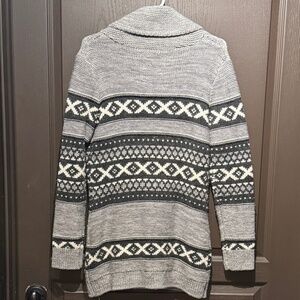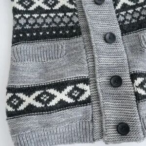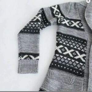 Stay warm and stylish with the Sansara Grey Aztec Knit cardigan sweater, featuring a Nordic-inspired geometric pattern .