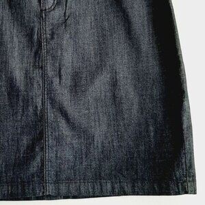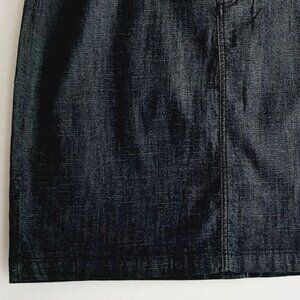 • Mini skirt in dark blue denim with classic 5-pocket styling, front button/zip closure and back slit.